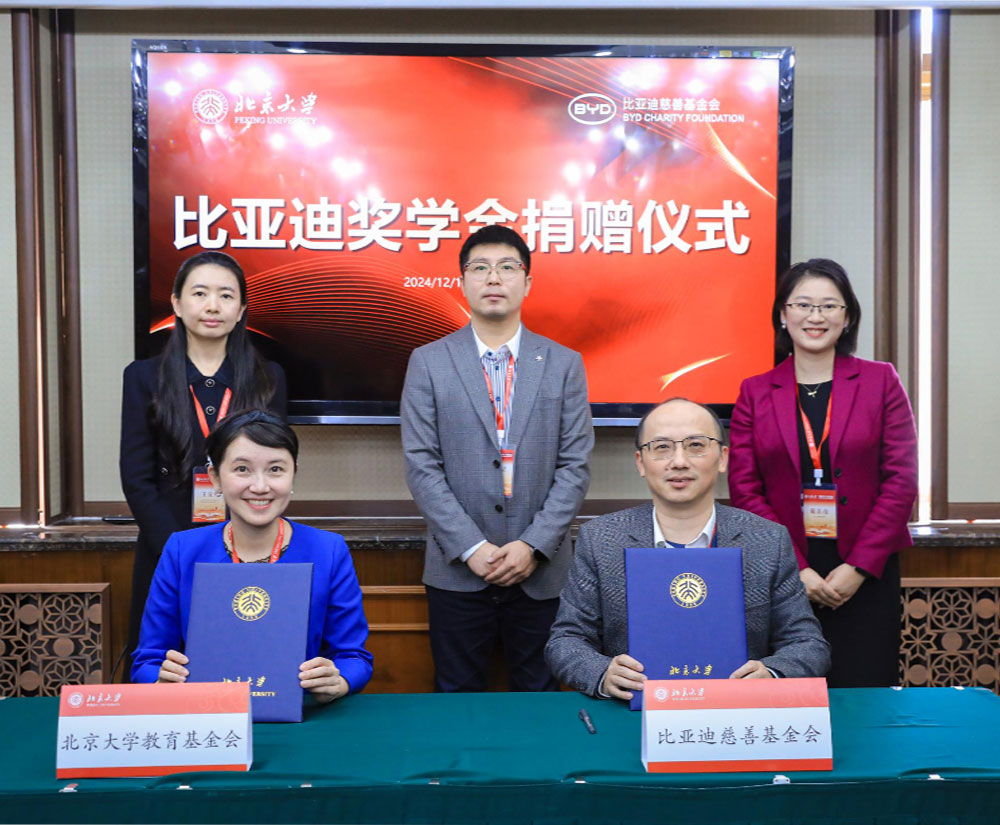 比亚迪奖学金签约仪式上,北京大学教育基金会副秘书长耿姝与比亚迪集团副总裁、第六事业部总经理陈刚代表校企双方签署协议。耿姝副秘书长向比亚迪集团致赠感谢状并表示奖学金评选对全体学生将起到重要的激励作用,基金会将坚守项目设立初衷,做好项目统筹管理,与比亚迪集团一道,引导鼓励更多优秀学子投身国家重点领域。集团副总裁、第六事业部总经理陈刚表示比亚迪作为一家致力于技术创新和社会责任的企业,将持续聚焦教育慈善,坚定支持高校学生在各专业领域的创新和科研活动,为国家培养更多的科技人才,希望通过设立奖学金,激励更多北大学子在新能源汽车、电池技术、环境保护等科研领域深耕细作,为国家产业的高质量发展贡献力量!同时也欢迎优秀的同学加入比亚迪,衷心祝愿母校蓬勃发展。