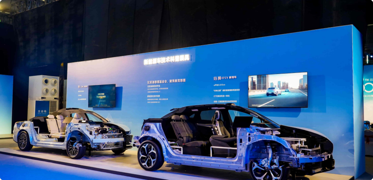 新能源车技术科普项目通过开发新能源车展具,即包括一套含纯电EV和双模DMi技术的声光电一体化的解剖车模型,让更多人了解新能源汽车技术,了解中国的绿色事业。